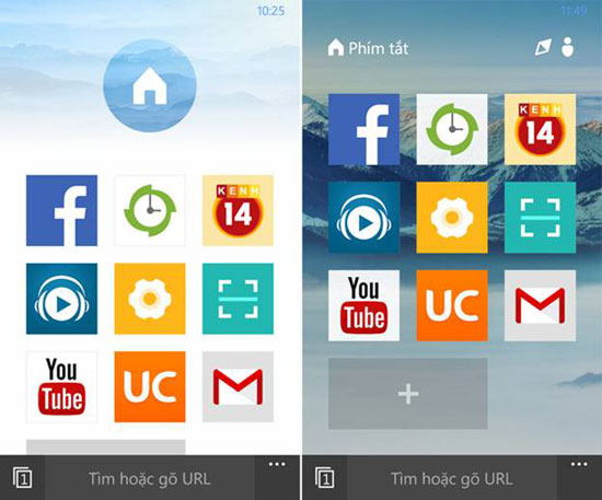 Thiết kế đặc biệt cho Windows Phone 8.1, UC Browser 4.0 có bộ điều khiển cử chỉ quản lý tab trực quan hơn. Bấm vào biểu tượng tab cạnh thanh địa chỉ để xử lý tab, tương tự như việc bạn quản lý chuyển đổi ứng dụng trên Windows Phone 8.1. Có thể xem toàn bộ tab rồi tùy chọn tab muốn mở. Trượt xuống hoặc click vào biểu tượng “X” để đóng tab, biểu tượng “+” để thêm tab mới.