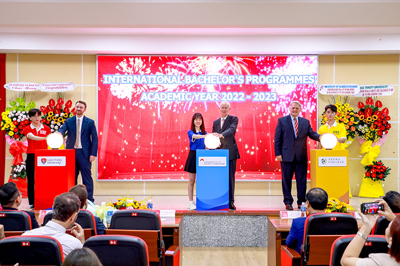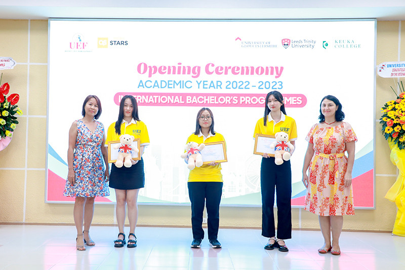 Dịp khai giảng năm nay, nhiều gương mặt sinh viên tài năng (GPA trên 3.9), các bạn tân sinh viên có thành tích tiếng Anh tốt (IELTS từ 6.0 trở lên), đạt học bổng tuyển sinh đầu vào các mức 50%, 25% được vinh danh. Nổi bật là tân sinh viên Nguyễn Duy Phước, chương trình Cử nhân Gloucestershire đạt IELTS 8.0, Nguyễn Minh Hoàng, chương trình Cử nhân Gloucestershire đạt IELTS 7.5; sinh viên Phạm Ngọc Phương Thảo, năm 3 chuyên ngành Tiếng Anh và Ngôn ngữ học, chương trình cử nhân Gloucestershire xuất sắc đạt GPA 3.97, IELTS 7.0 là gương mặt có thành tích học tập tốt, đạt học bổng tài năng trong lễ khai giảng. Phương Thảo cũng thuộc top 20 cuộc thi hùng biện “Speak to inspire Vietnam" được tổ chức bởi Đại sứ quán Hoa Kỳ, một trong 5 diễn giả chương trình TedxUEF 2022 cùng nhiều giải thưởng cao tại các cuộc thi của trường tổ chức. Tổng giá trị học bổng trao cho sinh viên các chương trình quốc tế hơn 5 tỷ đồng.