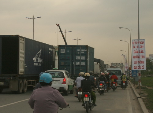 Trong khi đó, tại đầu nhánh cầu, những chiếc xe nặng nề bò qua cầu rất chậm và chen vào giữa dòng xe là hàng trăm xe gắn máy. Cảnh hỗn loạn ấy kéo dài trong suốt nhiều giờ và đỉnh điểm là vào các giờ cao điểm.