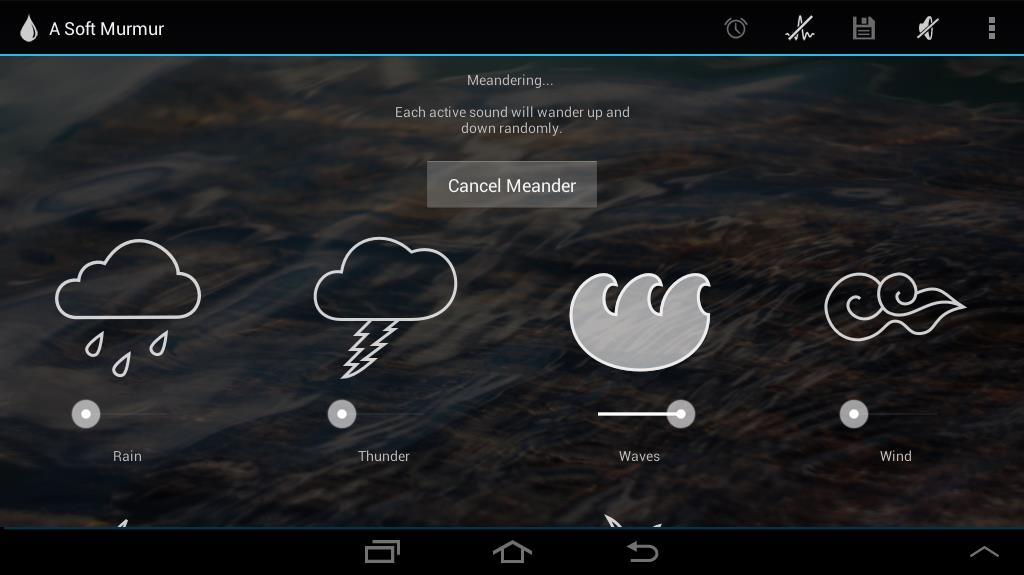 Khi muốn thư giãn, học tập, làm việc hay ngủ, bạn có thể dùng A Soft Murmur (miễn phí) để tìm ra cho mình âm thanh phù hợp nhất. Sau khi tải về, mọi âm thanh trong ứng dụng được lưu trong máy để nghe mà không cần kết nối mạng. A Soft Murmur cũng không có quảng cáo đi kèm. Âm thanh mà ứng dụng cung cấp khá đa dạng, từ tiếng thác nước, sấm sét, tiếng sóng đến tiếng chim hót.