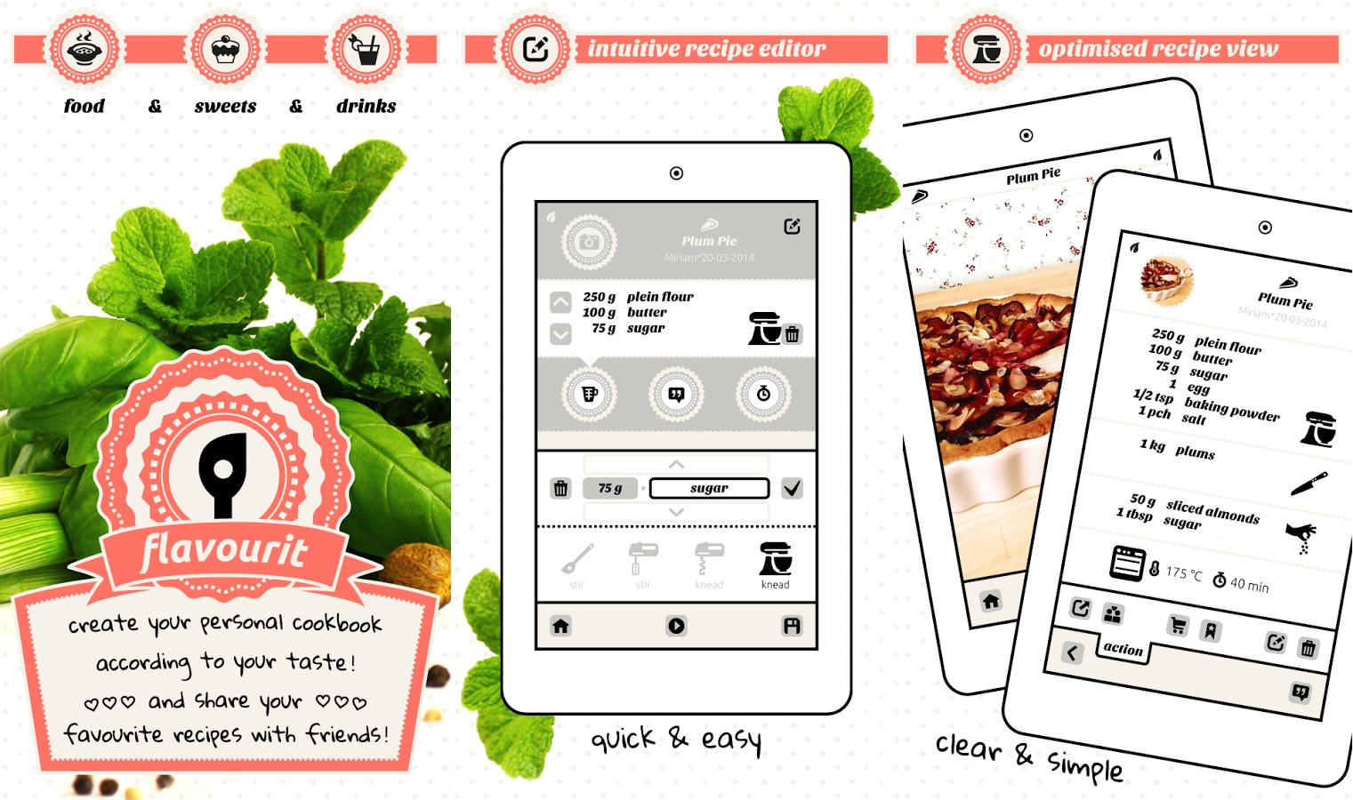 Nếu bạn yêu thích công việc bếp núc và muốn thưởng thức các món ngon lành, flavourit sẽ giúp bạn ghi chép lại các công thức nấu ăn của riêng mình để lưu giữ hoặc chia sẻ với bạn bè. Ứng dụng có nhiều biểu tượng ngộ nghĩnh, đáng yêu để làm công thức sinh động hơn. Có 3 danh mục chính là đồ ăn, đồ ngọt và đồ uống cùng 46 danh mục nhỏ hơn để bạn thoải mái lưu công thức.