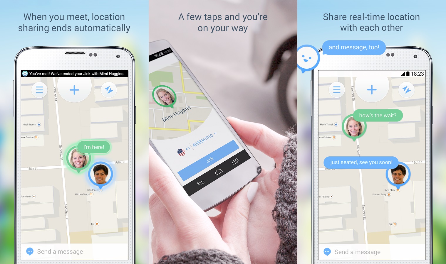 Chính sự đơn giản đã khiến Jink được nhiều báo công nghệ xếp vào ứng dụng nổi bật của tháng 7/2014. Jink cho phép người dùng chia sẻ địa điểm hiện tại chỉ bằng vài cái chạm nhẹ trên màn hình. Quá trình chia sẻ tự động kết thúc khi hai người gặp nhau. Tuy không nhiều tính năng, Jink lại tỏ ra hữu ích khi bạn muốn tìm kiếm ai đó, liên lạc với người khác khi đang lái xe, lạc đường… Địa điểm chỉ được chia sẻ với người bạn lựa chọn.