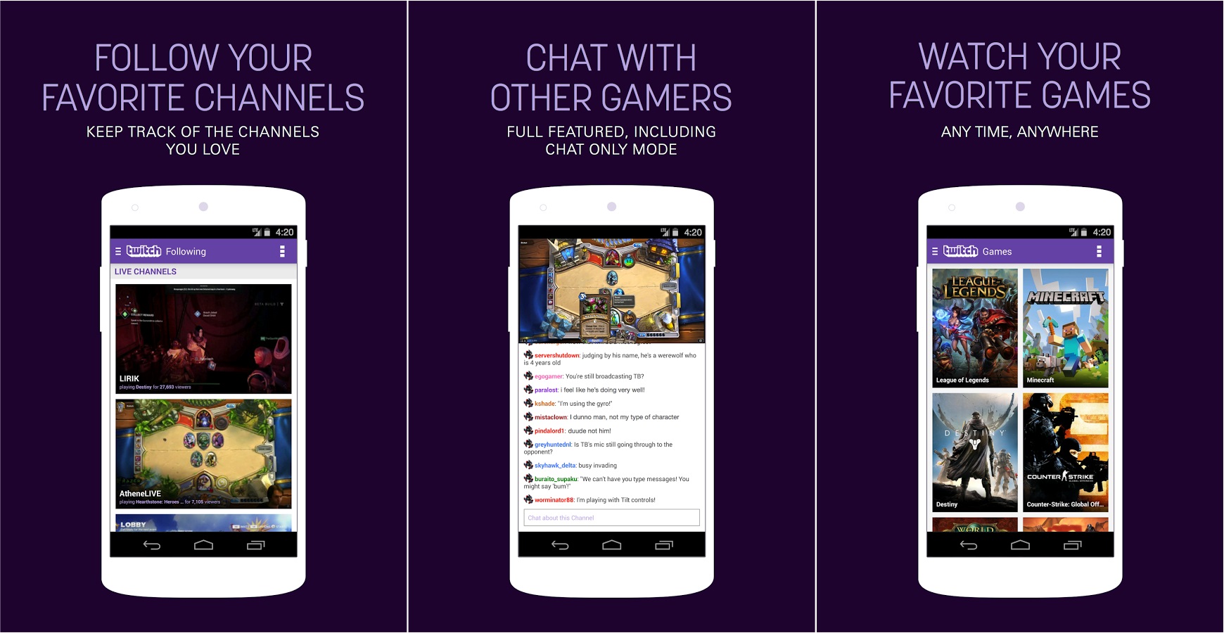 Với Twitch cho Android, bạn có thể xem trực tiếp các trận thư hùng giữa các game thủ và chat với người bạn theo dõi, dù đó là game League of Legends, Call of Duty, Minecraft hay Clash of Clans.