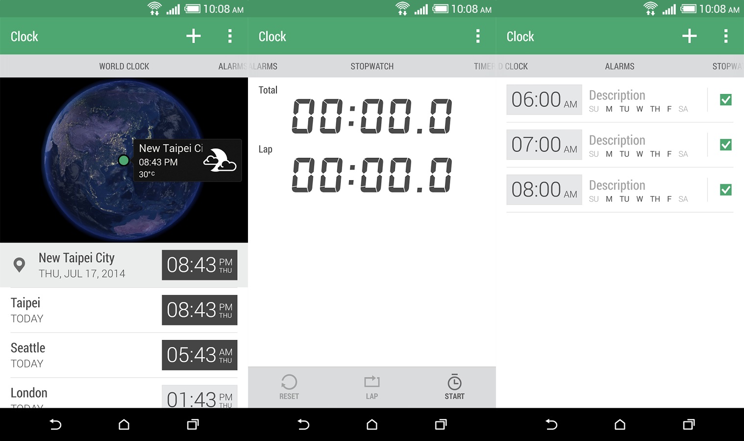 HTC Clock cung cấp các tính năng quản lý thời gian tốt hơn như World Clock (giờ tại vị trí hiện tại và trên thế giới), Alarm (báo thức), Stopwatch (đồng hồ đếm ngược) và Timer (hẹn giờ).