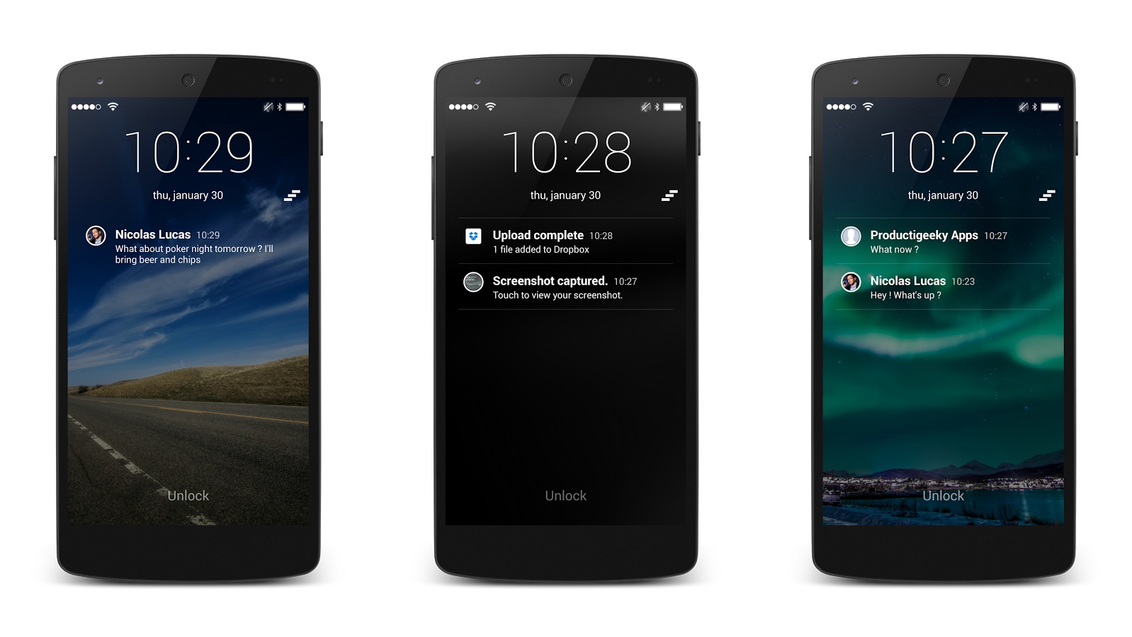 SlideLock mang lại bộ mặt mới cho màn hình khóa của thiết bị bằng các thông báo. Từ nay, bạn không cần phải vuốt để mở khóa và xem thông báo mới nữa, mọi thao tác đều có thể thực hiện ngay trên màn hình khóa. Vuốt sang phải để mở khóa, vuốt sang trái để kích hoạt ứng dụng chụp ảnh.