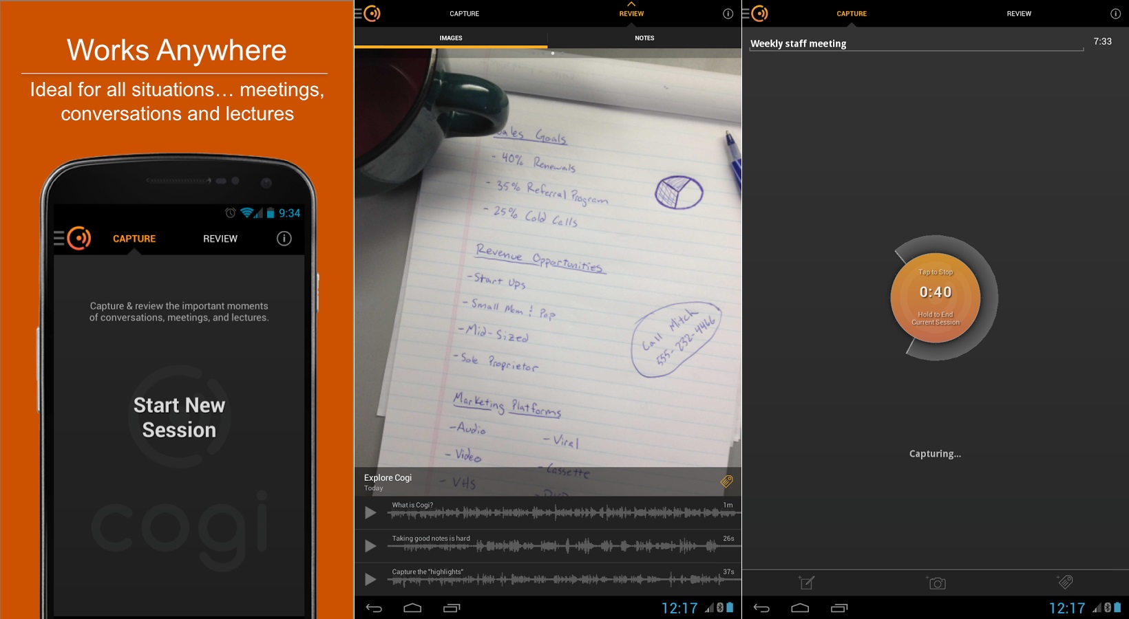 Cogi Notes là ứng dụng ghi chú và ghi âm đơn giản, cho phép vừa viết ghi chú và ghi âm cùng lúc. Bạn thậm chí còn có thể đánh dấu các điểm quan trọng trong các bản ghi âm này và tìm kiếm trong ghi chú. Tuy không có nhiều đột phá, tính đơn giản và miễn phí biến Cogi Notes thành ứng dụng đáng tải về.