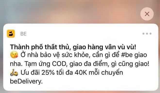 Sáng nay 3/4, nhiều người dùng nhận được tin nhắn của ứng dụng be với tựa đề “Thành phố thất thủ, giao hàng vẫn vù vù”. Nội dung này khiến nhiều người phản ứng.