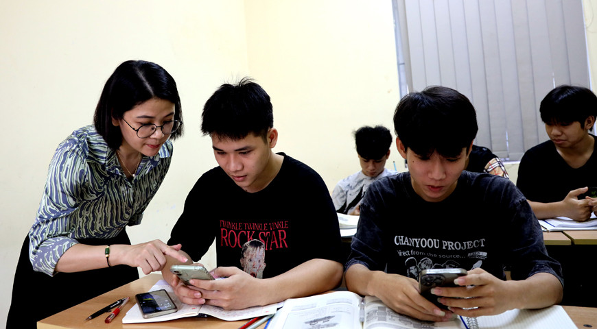 Cán bộ Trung tâm Dịch vụ việc làm thanh niên hướng dẫn các học viên cài đặt app i-HR