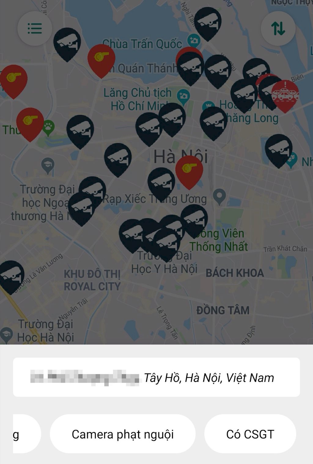 Ứng dụng chỉ ra các vị trí đặt camera, chốt CSGT. Ảnh chụp màn hình. |