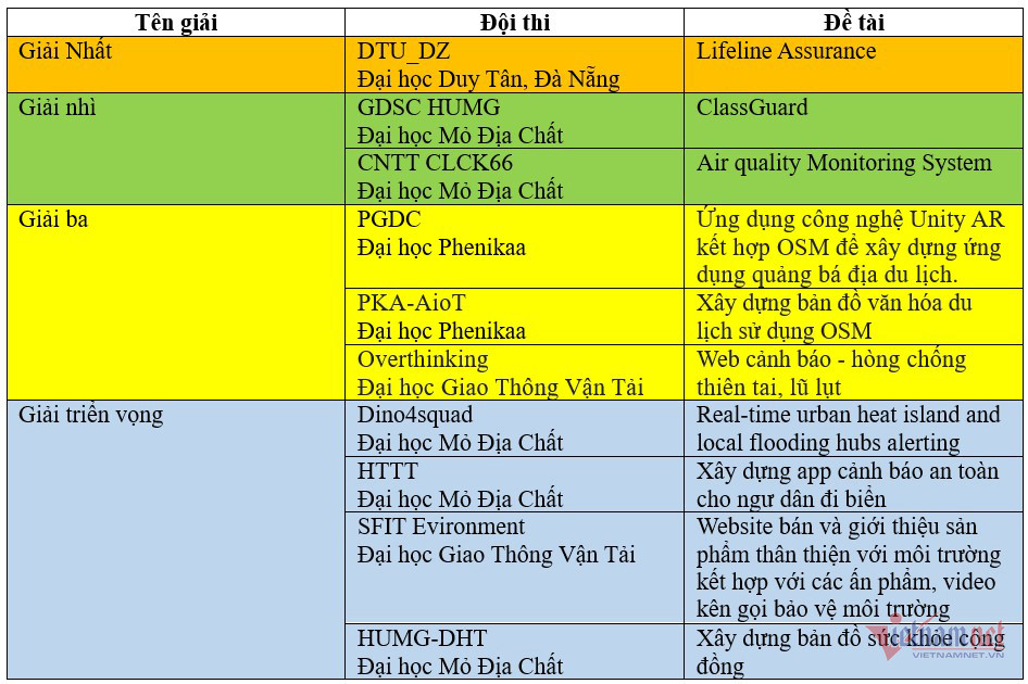 Bên cạnh giải Nhất thuộc về nhóm sinh viên Đại học Duy Tân, Ban tổ chức còn trao 2 giải Nhì, 3 giải Ba và 4 giải Triển vọng cho dự án của các đội sinh viên khác. Cụ thể, giải Nhì đã được trao cho 2 đội sinh viên GDSM HUMG và CNTT CLCK66 cùng của Đại học Mỏ - Địa chất. Dự án của các đội PGDC (Đại học Phenikaa), PKA-AioT (Đại học Phenikaa) và Overthinking (Đại học Giao thông vận tải) đều được trao giải Ba của cuộc thi.