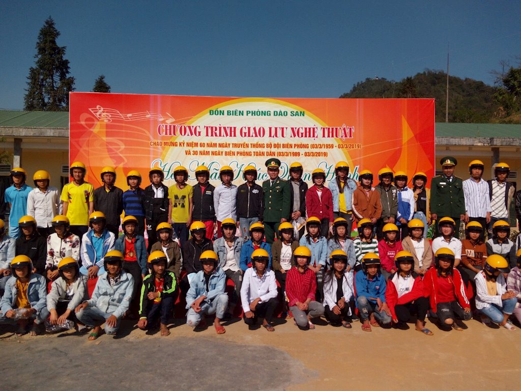 "be" tặng mũ bảo hiểm cho chiến sĩ và nhân dân tại Dào San. Ảnh: Be |