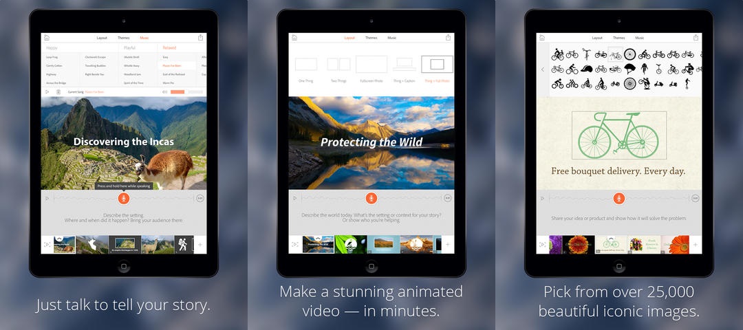 Adobe là công ty tạo ra các ứng dụng tiêu chuẩn về sáng tạo và Adobe Voice là một ứng dụng như vậy. Nó cho phép bạn ghi âm một câu chuyện và tự chọn các hình ảnh minh họa trong thư viện hơn 25.000 biểu tượng và hàng triệu ảnh có sẵn. Adobe Voice tự động thêm các hiệu ứng phim ảnh và nhạc nền cho câu chuyện của bạn.