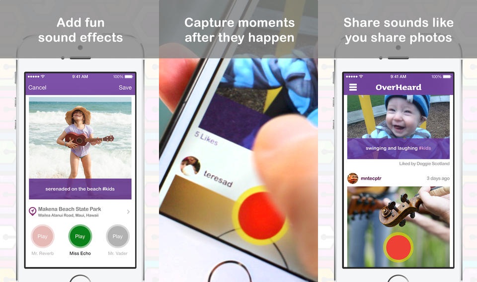 OverHeard cho iOS muốn khai thác những gì mà Vine đã làm cho video song đối tượng của ứng dụng lại là âm thanh. Ứng dụng có thể ghi âm tối đa 3 phút rồi thêm vào các hiệu ứng vui nhộn.