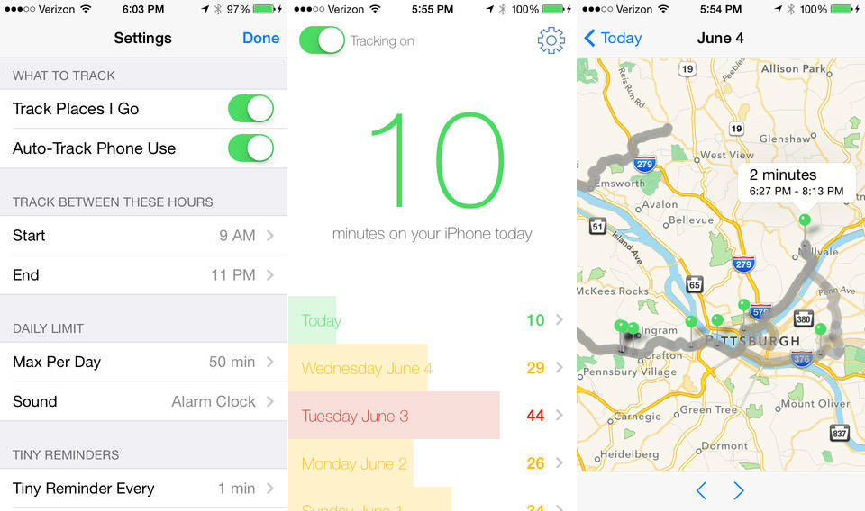 Moment là ứng dụng dành riêng cho người nghiện iPhone. Nó theo dõi thời gian sử dụng iPhone trong ngày và nhắc nhở người dùng nếu họ đang dùng quá nhiều. Ngoài ra, Moment còn dùng GPS để theo dõi vị trí hàng ngày của bạn và ghi nhớ trên bản đồ.