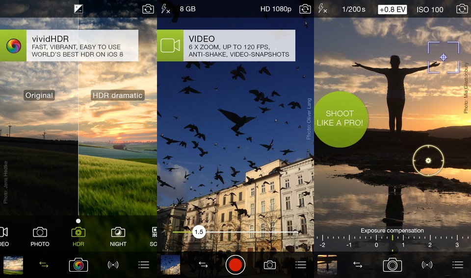 ProCamera 8 (miễn phí) là bản cập nhật của ProCamera 7. Đây là ứng dụng thay thế ứng dụng chụp ảnh gốc trên iOS, đơn giản song càng đào sâu lại có được vô số tính năng nâng cao. ProCamera 8 chạy ổn định, mượt mà, độ trễ không đáng kể. Phần mềm có đầy đủ chế độ chỉnh thủ công với giao diện dễ hiểu. Bạn có thể cài đặt ISO, tốc độ màn trập, cân bằng trắng, bù sáng, lấy nét… Ngoài ra, còn có biểu đồ báo hiệu khi bạn chỉnh “quá tay” để có điểm dừng hợp lý. Một số tùy chọn khác bao gồm chống rung, hẹn giờ, hỗ trợ định dạng TIFF.