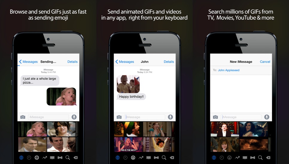 Khi lời nói chưa đủ để diễn tả những gì bạn muốn chia sẻ, emoji chưa thể biểu đạt cảm xúc thay bạn, GIF Keyboard (miễn phí) sẽ lên tiếng. Ứng dụng giúp bạn gửi đi các hình ảnh động hay video tới bạn bè ngay từ bàn phím. Bạn có thể tìm kiếm hàng triệu ảnh GIF và video để tìm ra thứ phù hợp nhất để gửi hoặc lưu lại trong trình duyệt Safari.