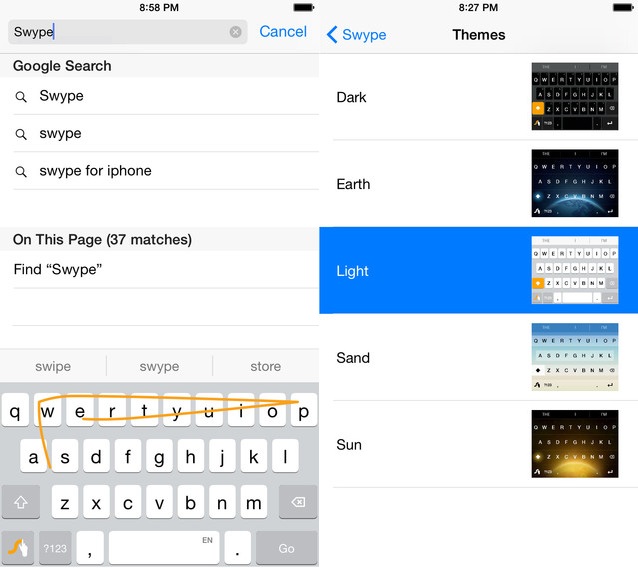 Sau khi khởi xướng cuộc cách mạng nhỏ cho ứng dụng bàn phím, Swype (0,99 USD) - ứng dụng vuốt để nhập ký tự - đầu tiên đã có mặt trên iOS, thiết lập tiêu chuẩn mới cho tốc độ gõ và sự chính xác. Bạn chỉ cần vuốt để viết chữ thay vì “mổ cò” từng phím như trước đây. Swype cũng có nhiều chủ đề màu để lựa chọn.