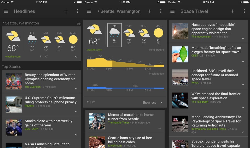 Ứng dụng thời tiết và tin tức của Google (miễn phí) lấy tin từ 65.000 ấn phẩm trên thế giới, chia thành các mục nhỏ như tin nóng, công nghệ, thể thao. Bạn có thể thay đổi bố cục tùy theo quốc gia đang sống, cá nhân hóa mục tin tức như Hollywood, NASA, thời trang. Chạm vào một câu chuyện cụ thể để xem các bài báo chuyên sâu, ý kiến, bình luận.