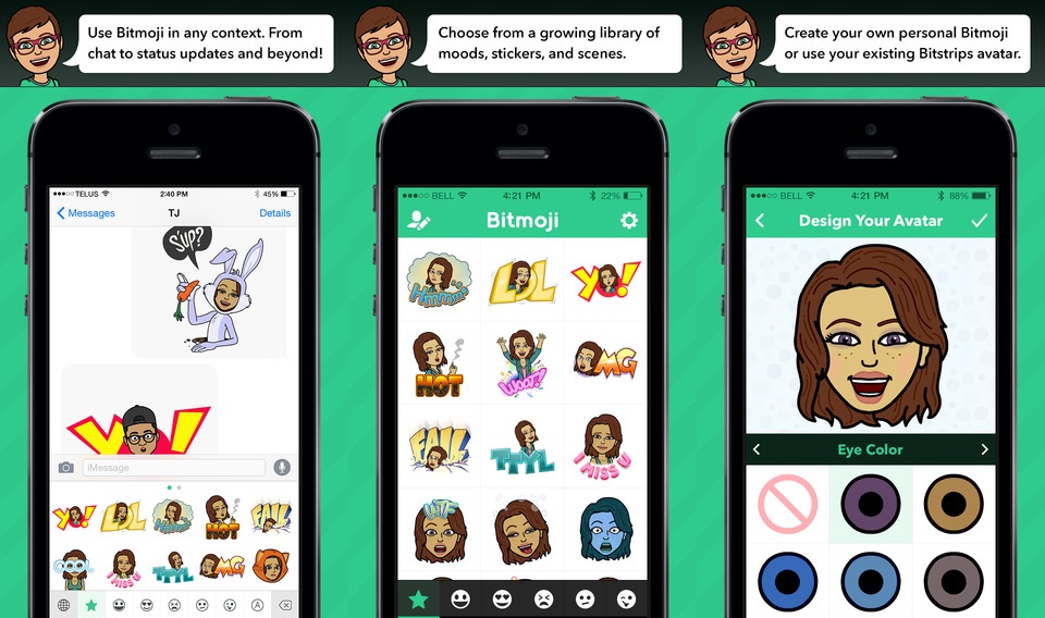 BitMoji (miễn phí) là ứng dụng giúp bạn tự sáng tạo ra biểu tượng emoji cho riêng mình. Bạn có thể lựa chọn từ thư viện hàng trăm trạng thái, sticker, nhân vật hoạt hình để sử dụng trong iMessage, WhatsApp…