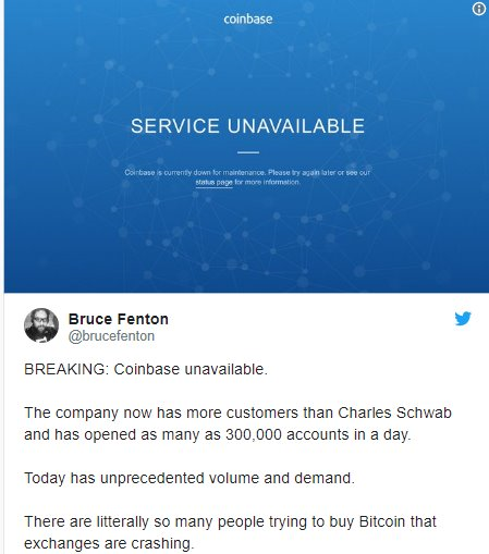Điều này khiến người tiêu dùng vui mừng chưa được bao lâu thì một trục trặc khác đã xảy ra, khi mà ứng dụng Coinbase đã hầu hết không hoạt động được trong ngày này. Tính đến thời điểm hiện nay, lần trục trặc gần đây nhất của Coinbase là khi Bitcoin mới chỉ ở mức hơn 2.000 USD. Một trong những nguyên nhân chính là giá Bitcoin cũng vừa vượt qua mức 17.000 USD, tăng 20% chỉ trong vòng 24 giờ.