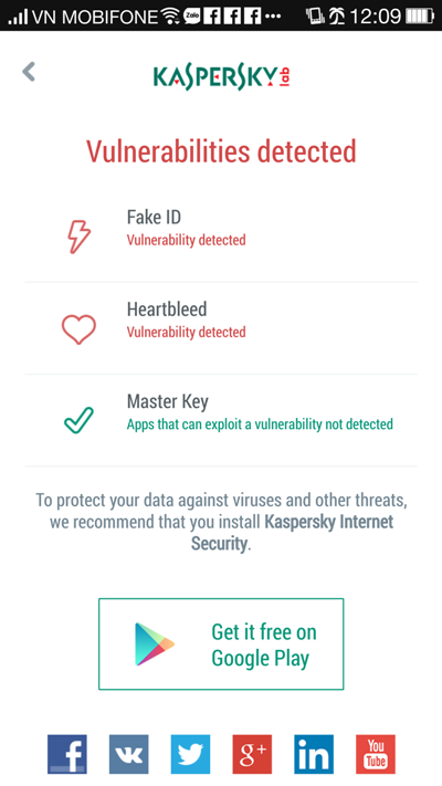 Ngay sau khi phát hiện có mối đe dọa, ứng dụng Kaspersky Free Fake ID Scanner sẽ nhắc nhở người dùng cài đặt một phiên bản miễn phí của Kaspersky Internet Security dành cho Android, sản phẩm sẽ bảo vệ thiết bị chống lại sự tấn công của các phần mềm độc hại khai thác lỗ hổng.