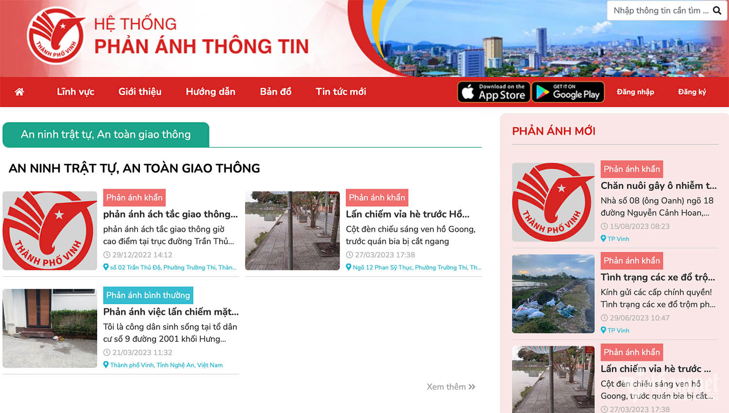 Chúng tôi truy cập vào ứng dụng Vinh Smart, đọc qua màn hình chính, ở phần đầu tiên mục tin: An ninh trật tự, an toàn giao thông có bản tin: “Phản ánh ách tắc giao thông giờ cao điểm trên trục đường Trần Thủ Độ” từ cuối tháng 11/2022 vẫn còn để nguyên vị trí, chưa có bản tin nào thay thế.