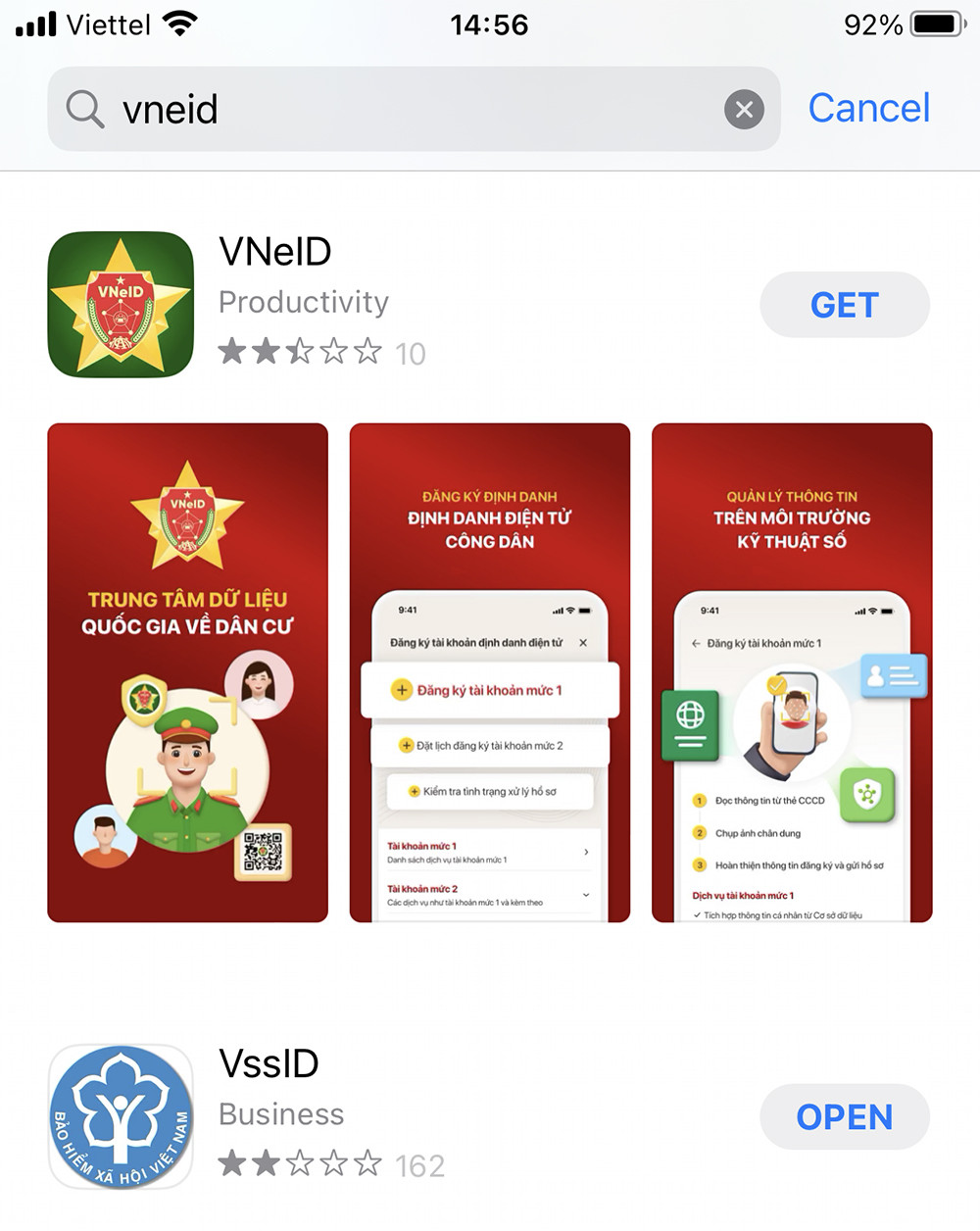Đối với thiết bị sử dụng hệ điều hành iOS, người dùng chọn kho ứng dụng App Store. Tại thanh tìm kiếm, tìm từ khoá “VNeID”. Sau khi app VNeID hiển thị , chọn “Nhận” (Get) để tải ứng dụng VNeID về máy.