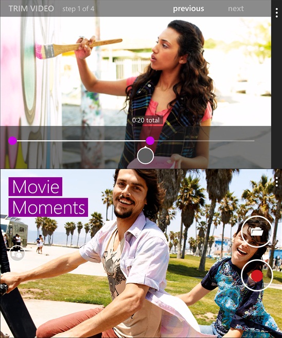 Ứng dụng chỉnh sửa video đầu tiên cho Windows Phone 8.1 đã xuất hiện. Với Movie Moments, bất kỳ đoạn video nào cũng trở thành khoảnh khắc khó quên để chia sẻ. Bạn có thể cắt xén, chỉ giữ lại đoạn yêu thích nhất, nhấn mạnh các điểm đáng chú ý bằng chú thích hay hiệu ứng, thêm nhạc nền. Phần mềm có sẵn một số bài hát phù hợp với từng tâm trạng khác nhau hoặc cho phép chọn từ thư viện nhạc.