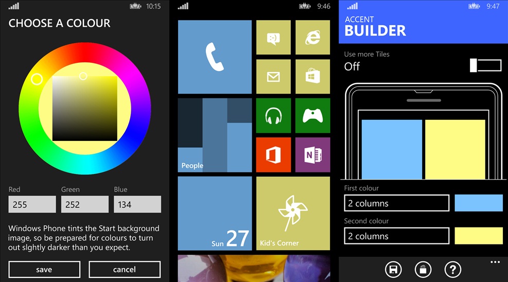 Nếu đã chán bố cục ô cơ bản trong Windows Phone, bạn có thể sử dụng Accent Builder để thay đổi. Đây là ứng dụng cho phép lựa chọn màu nền khác biệt cho 6 cột ô trên màn hình chính và đặt vào đó bao nhiêu mục tùy thích mà không làm ảnh hưởng đến hiệu suất thiết bị.