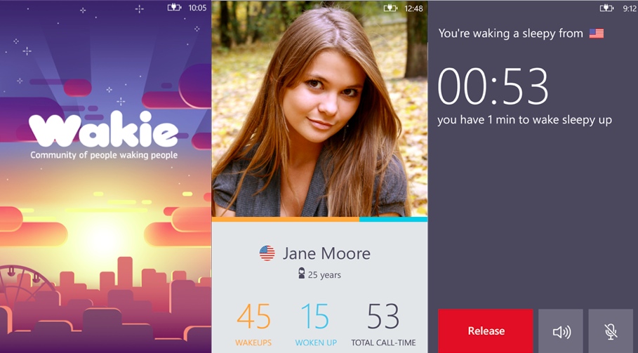 Wakie (miễn phí) cho Windows Phone là ứng dụng báo thức kết hợp tính năng của mạng xã hội. Khi đăng ký dịch vụ, bạn có thể đặt giờ và sau đó được một thành viên khác của Wakie (ngẫu nhiên hoặc chọn sẵn) gọi điện đánh thức. Cuộc gọi tự động kết thúc sau 1 phút. Đây là một trong các dự án được nhiều trang web công nghệ đánh giá cao về tính sáng tạo và thực tiễn.