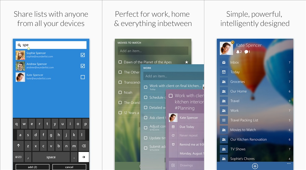 Dù đang trong cửa hàng tiện lợi, làm việc trong dự án, lên kế hoạch du lịch, Wunderlist (miễn phí) cho phép bạn chia sẻ ý tưởng, danh sách việc phải làm và xây dựng cùng người khác. Ứng dụng đồng bộ giữa điện thoại, máy tính, tablet để truy cập danh sách bất cứ lúc nào. Bạn có thể đính kèm ảnh, file PDF, trình chiếu vào danh sách, cài đặt nhắc nhở để không bỏ lỡ lịch quan trọng.