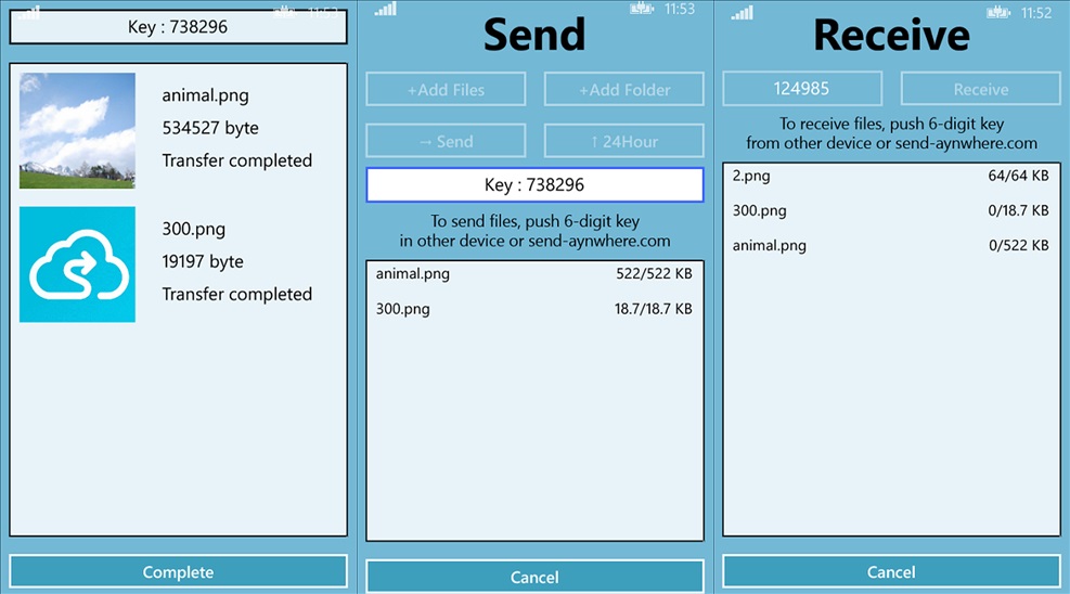 Với ứng dụng Send Anywhere (miễn phí), bạn có thể chia sẻ bất kỳ file gì (ảnh, ứng dụng, video) dung lượng lớn hay nhỏ đến mọi thiết bị di động (Windows Phone, Android, iPhone, iPad, iPod) và máy tính (thông qua trang https://send-anywhere.com). Ưu điểm của dịch vụ là bạn không cần đăng ký hay đăng nhập, chỉ cần nhập mã 6 chữ số để kết nối các thiết bị với nhau.