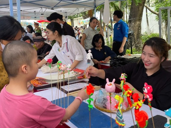 Ngày 4/10, đưa con từ phòng bệnh xuống sân chơi tổ chức Trung thu của Bệnh viện Nhi Trung ương, chị M., rơi nước mắt khi con hào hứng với gian hàng nặn tò he và viết thư pháp. "Con chỉ xin một hình tò he bác sĩ và bức thư pháp ghi chữ bình an", chị chia sẻ.