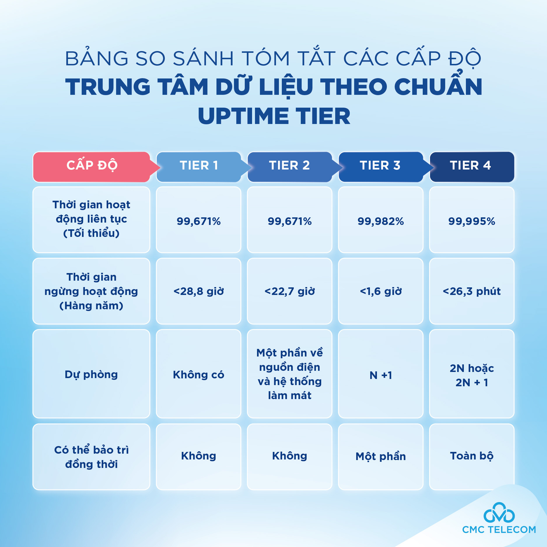 Theo hệ thống đánh giá bởi Uptime Institute, Data Center (DC) được chia thành bốn cấp độ, từ Tier I đến Tier IV, mỗi cấp độ tương ứng với một mức độ tin cậy và khả năng hoạt động liên tục khác nhau. Các cấp độ Uptime Tier được xác định dựa trên sự đảm bảo tính sẵn sàng của hệ thống và khả năng chịu lỗi.