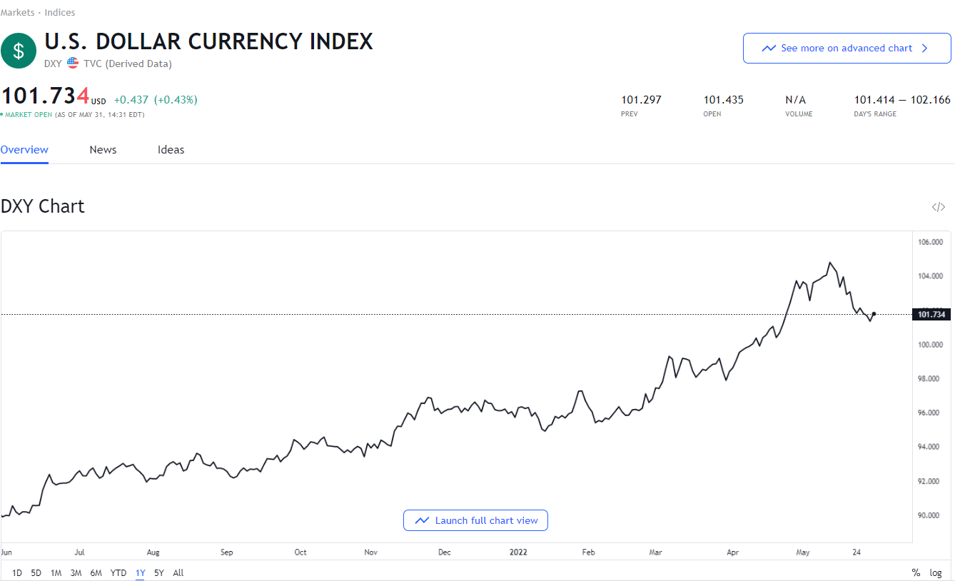 Đầu phiên giao dịch ngày 1/6 chỉ số US Dollar Index (DXY), đo lường biến động đồng bạc xanh với 6 đồng tiền chủ chốt (EUR, JPY, GBP, CAD, SEK, CHF), đứng ở mức 101,750, giảm 2,9% so với mức đỉnh ngày 12/5 là 104,84 điểm.
