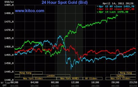 Trước đó, trong phiên giao dịch 11-4, giá vàng đã lập mức cao kỷ lục mọi thời đại là 1.478 USD/ounce.