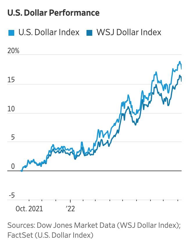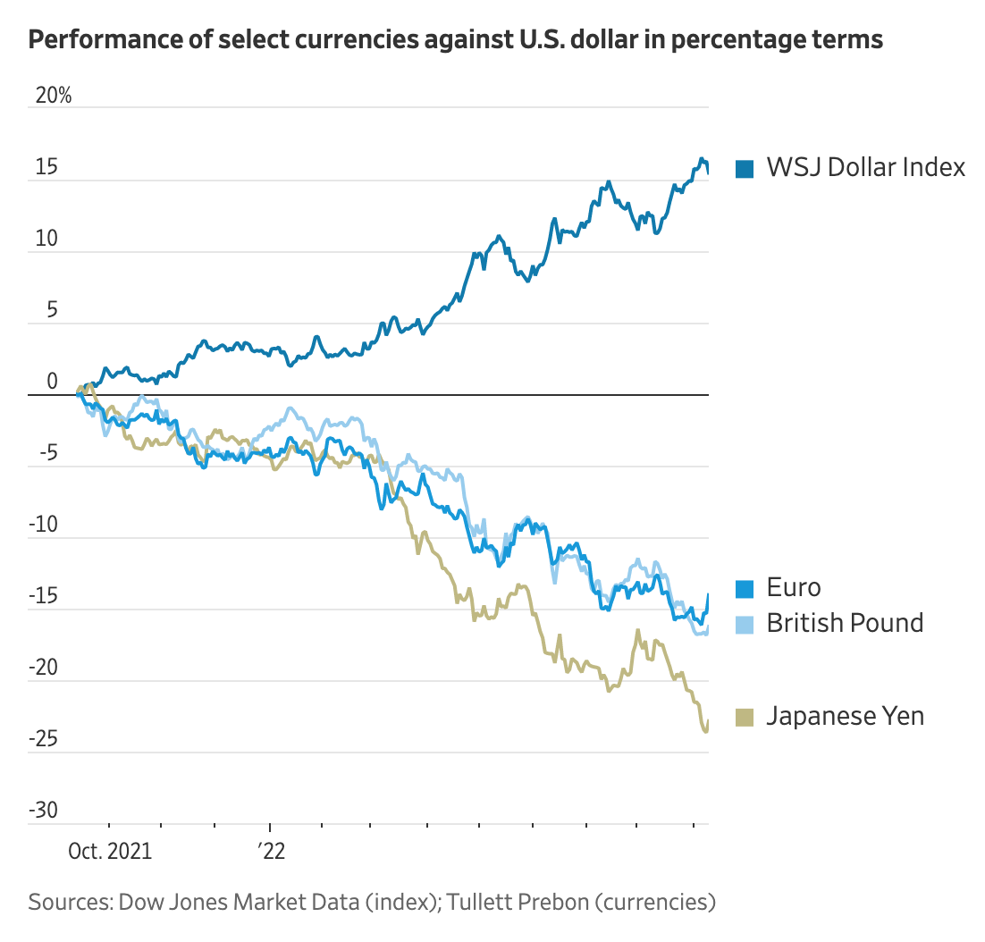 Kể từ đầu năm tới nay, USD tăng giá 17% so với đồng bảng Anh và vượt qua ngưỡng 1 USD đổi 1 euro lần đầu tiên trong 2 thập kỷ. Chỉ số WSJ Dollar - đo sức mạnh của USD so với rổ các đồng tiền khác cũng đã tăng 13% kể từ đầu năm 2022.