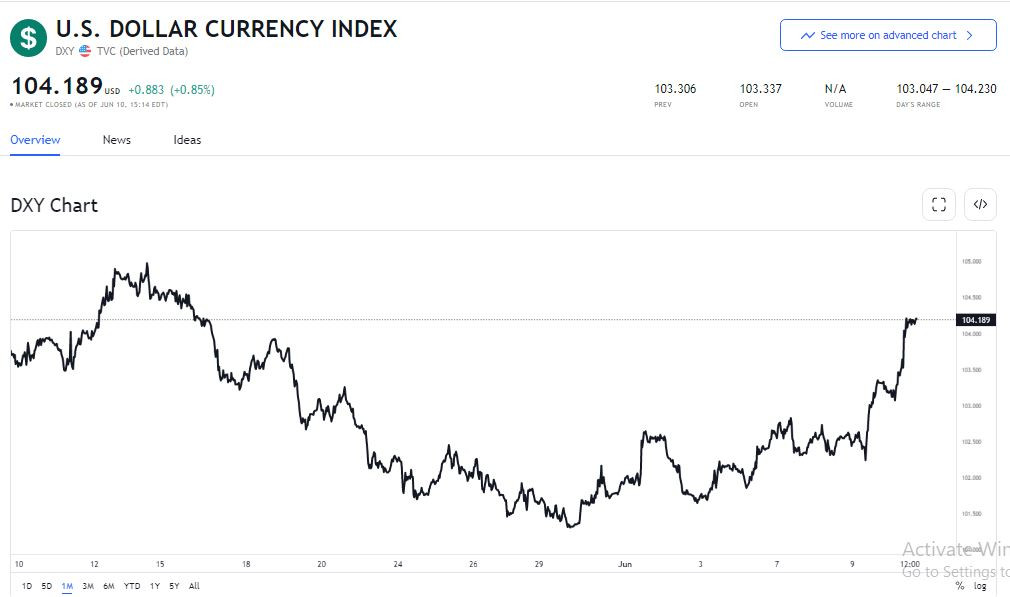 Chỉ số DXY tăng 0,8% so với mức thấp trong nhiều tuần qua, đạt 104,15 điểm vào chiều thứ 6 theo giờ Mỹ, tiến sát mức cao lịch sử ngày 13/5. Bởi, giới đầu tư Mỹ đang đổ xô mua USD khi nhận thấy lạm phát sâu hơn dự đoán. Số liệu mới công bố đang làm lu mờ kỳ vọng về việc lạm phát đã đạt đỉnh và bắt đầu hạ nhiệt. Hiện chỉ số DXY vẫn duy trì ở mức trên 104 điểm.