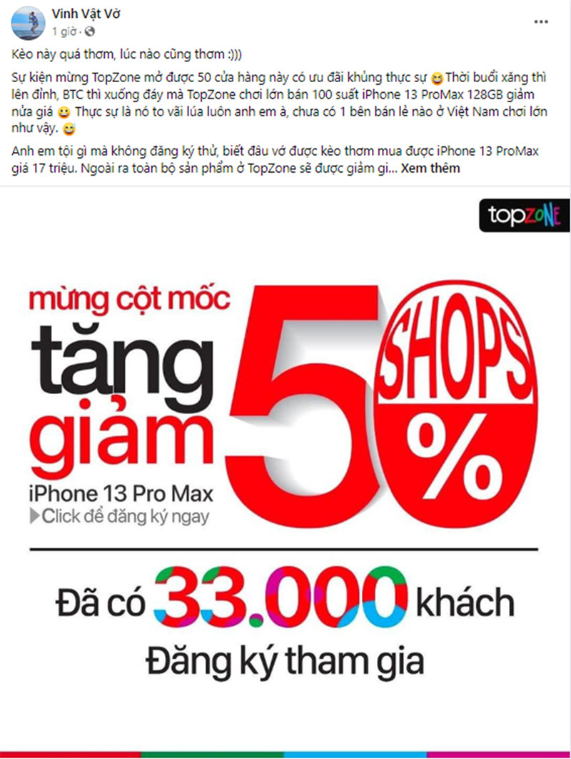 Thế nhưng, để ăn mừng cột mốc mở 50 cửa hàng chỉ sau 8 tháng trình làng chuỗi uỷ quyền trực tiếp và cao cấp TopZone của Apple đã công bố chương trình ưu đãi chưa từng có: 100 suất mua iPhone 13 ProMax 128GB giảm liền tay 50%, giá chỉ còn 17 triệu đồng.