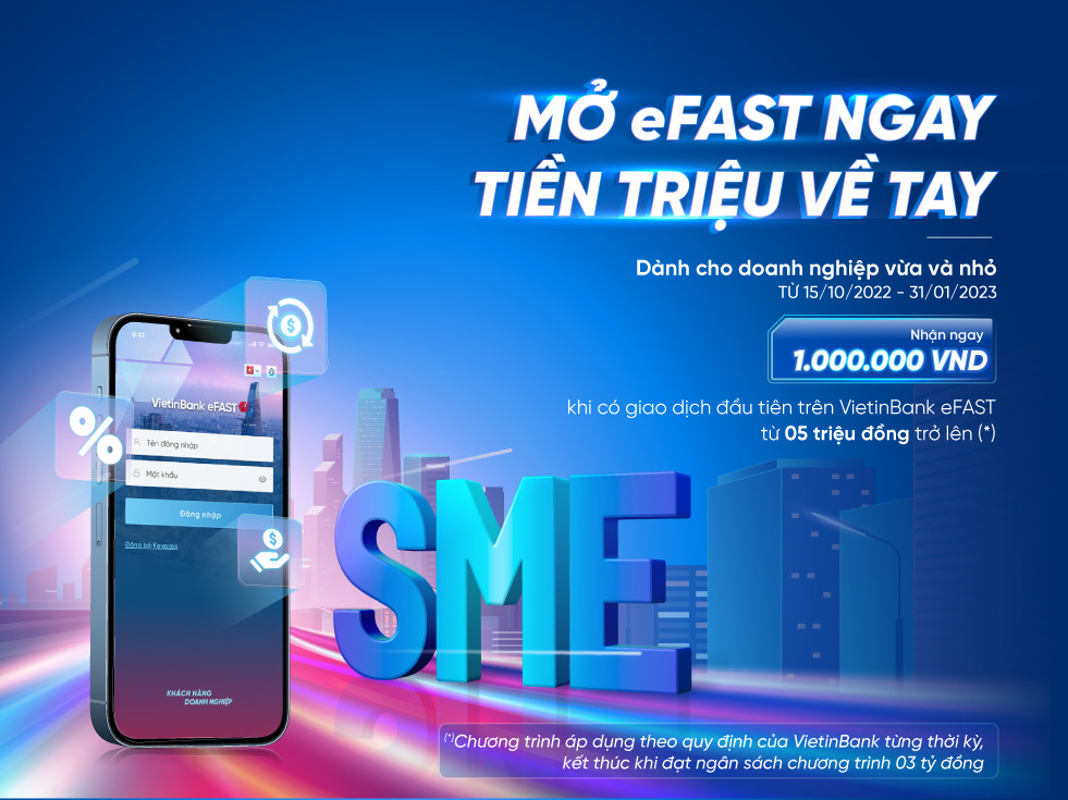 Theo đó, VietinBank tặng 1 triệu đồng cho 3.000 khách hàng doanh nghiệp đầu tiên khi đáp ứng các điều kiện: Thuộc phân khúc doanh nghiệp vừa và nhỏ; Lần đầu tiên giao dịch hoặc không có giao dịch với VietinBank trong vòng 6 tháng tính đến thời điểm áp dụng khuyến mãi; Đăng ký dịch vụ ngân hàng số VietinBank eFAST và thực hiện giao dịch chủ động hợp lệ đầu tiên với giá trị tối thiểu 5 triệu đồng trên eFAST. Thời gian chương trình khuyến mãi từ ngày 15/10/2022 - 31/1/2023.