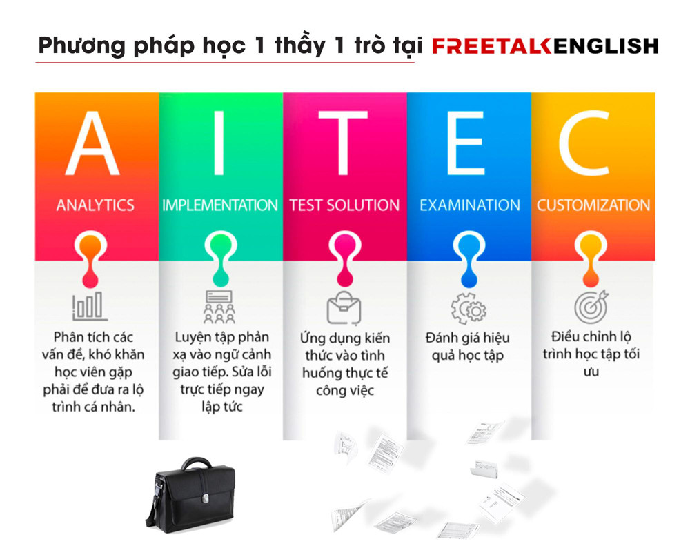 Học viên tại Freetalk English được tiếp cận với các phương pháp xoay vòng cùng 5 bước tiêu chuẩn- A.I.T.E.C, phương pháp học giao tiếp hiện đại bậc nhất hiện nay, được ứng dụng rộng rãi trong các trường đại học về ngôn ngữ trên thế giới, với mục tiêu giúp người học có thể đạt được cấp độ phản xạ giao tiếp trong thời gian từ 1-3 tháng.