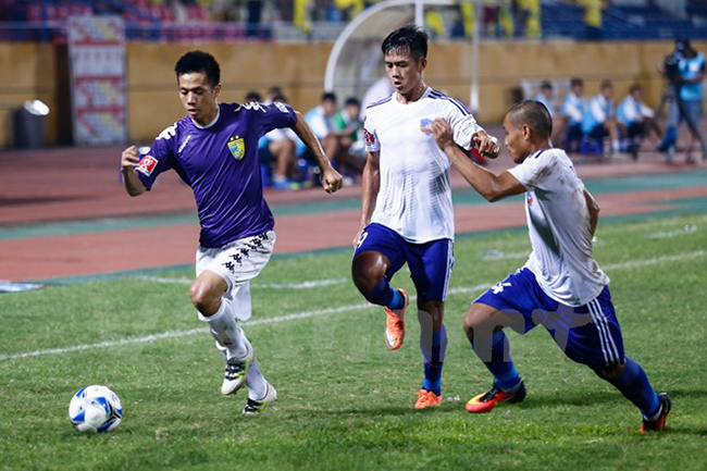 | Đồng thời CLB Hà Nội (áo xanh) cũng không lơi chân khi cửa vô địch vẫn còn |