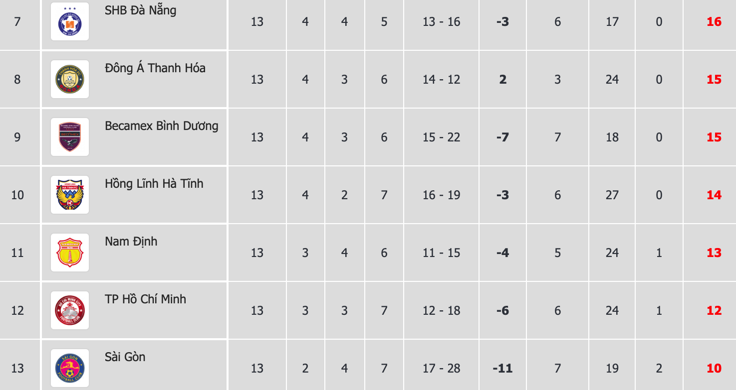 Sau 14 vòng đấu, Sài Gòn hiện đang đứng cuối BXH với 10 điểm, nhưng đội bóng này chỉ kém đội đang đứng thứ 7 là SHB Đà Nẵng chỉ 6 điểm.