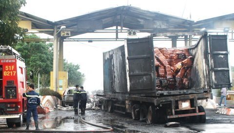 Tại hiện trường, xe du lịch chỉ còn trơ khung sắt. Xe đầu kéo bị cháy rụi, chỉ còn lại động cơ cháy đen, phủ đầy tro bụi. Toàn bộ cao su trong container bị chảy nhão, hư hỏng hoàn toàn. Giao thông qua trạm thu phí phải tạm thời chuyển qua hướng khác.
