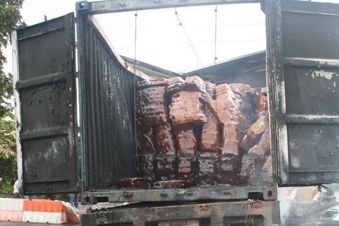 Ngọn lửa càng lúc càng lớn. Thùng container 40 feet chứa đầy cao su đã qua sơ chế ép thành khối biến thành “mồi ngon” cho lửa. Mùi khét của cao su và khói đen bốc lên nồng nặc lan tỏa cả khu vực rộng lớn.