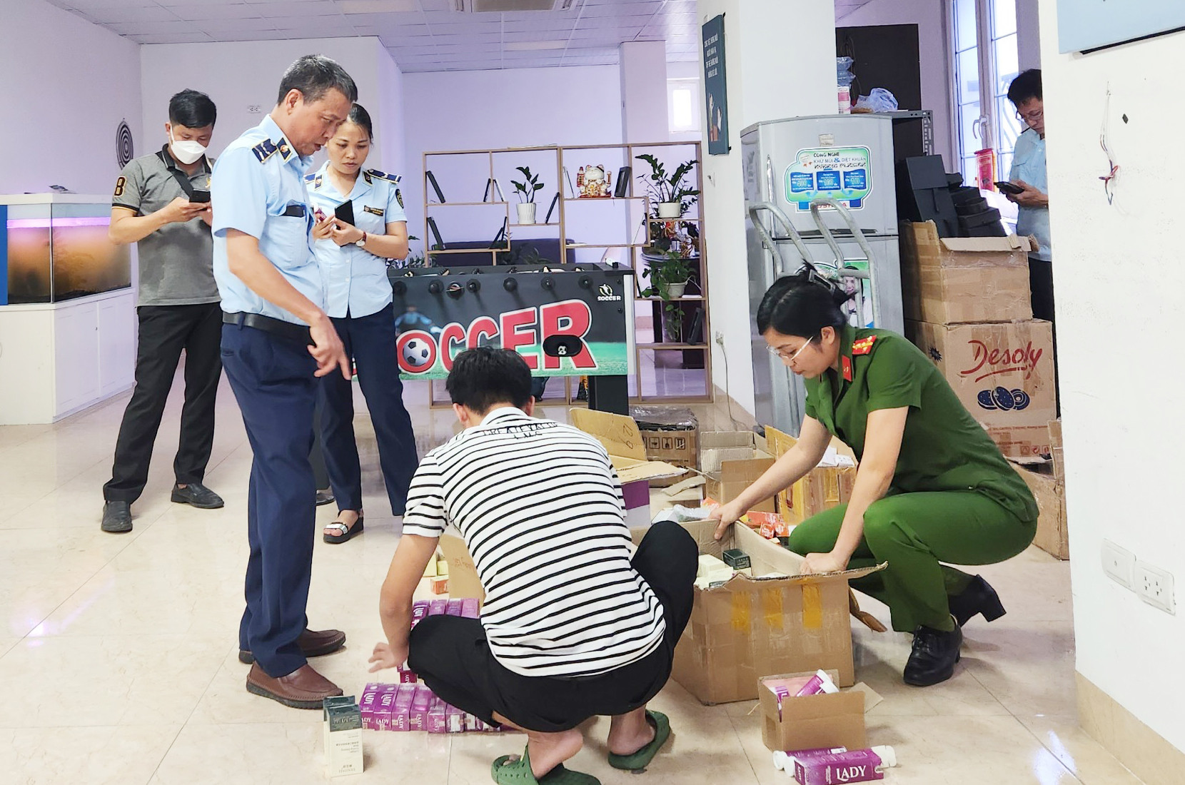 Công an phối hợp với lực lượng chức năng, kiểm tra tầng 4 tòa nhà Time coffee thu giữ hàng trăm hộp thực phẩm bảo vệ sức khỏe nhãn hiệu LADY, Vinslim V3, Collagen Firming Sleeping Mark không có hóa đơn chứng từ.