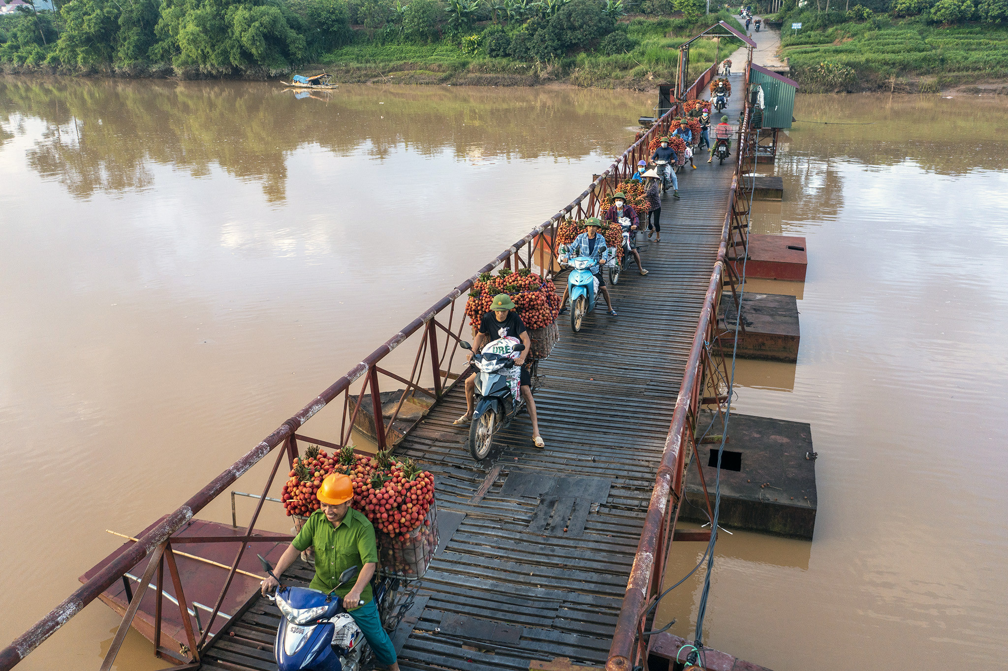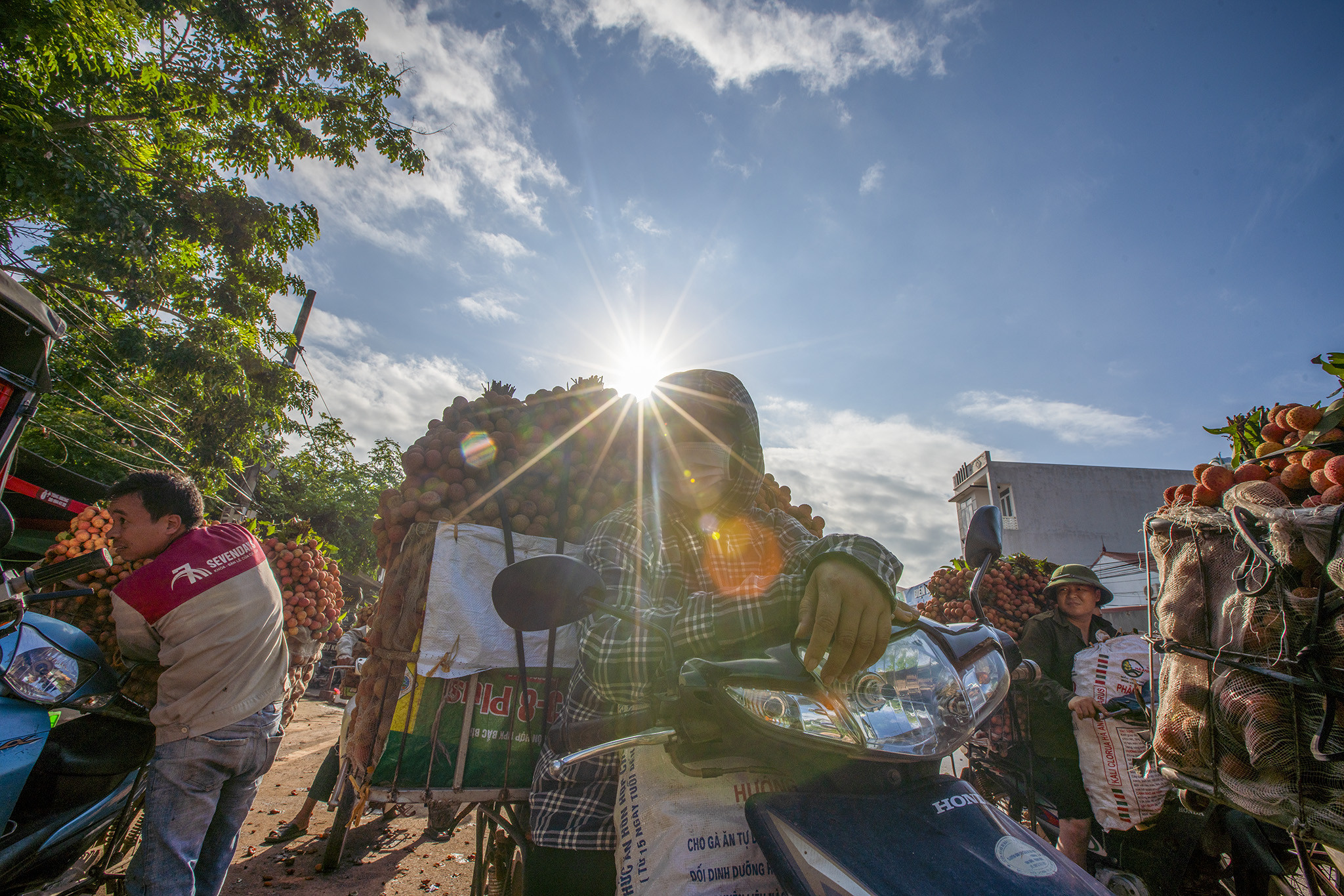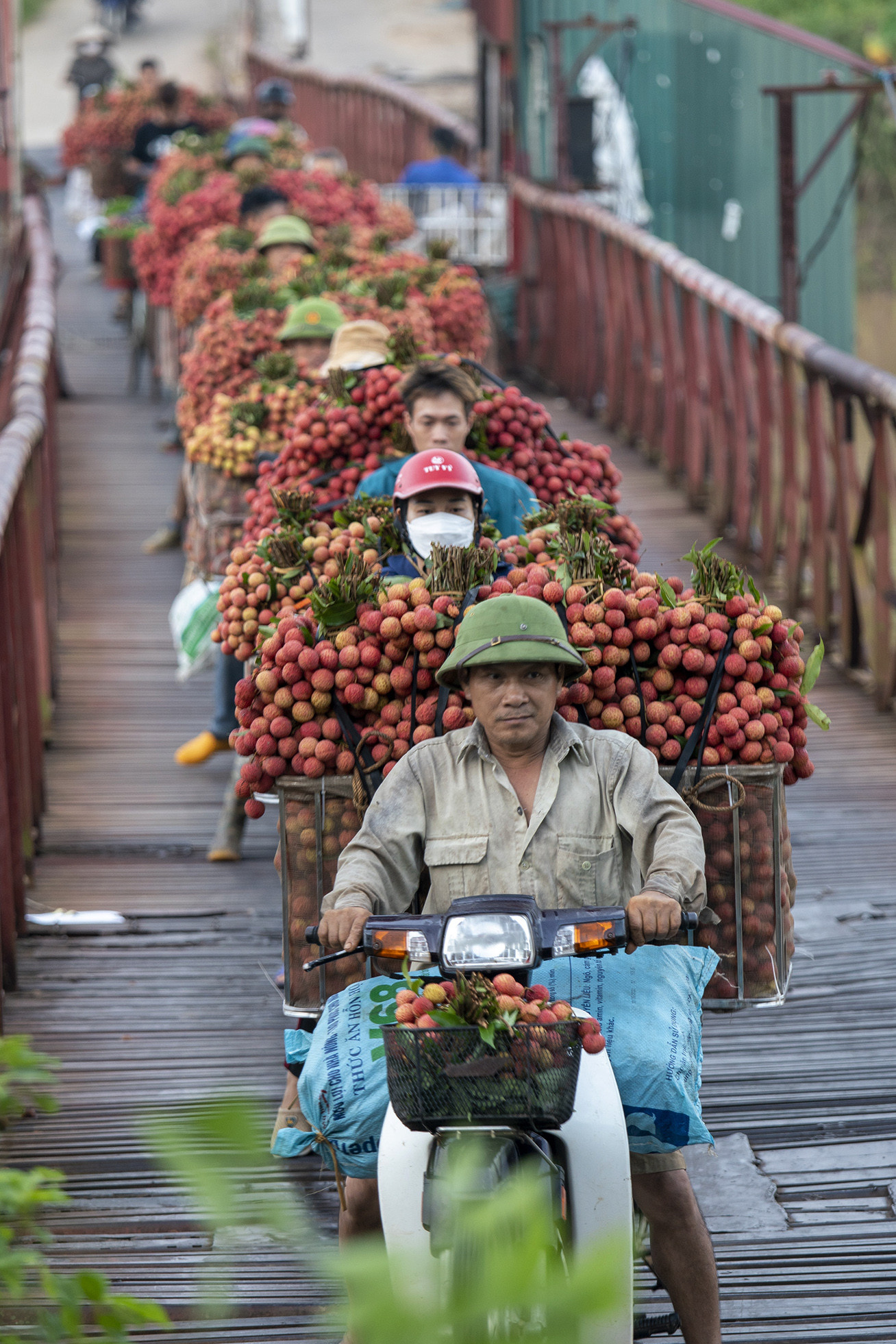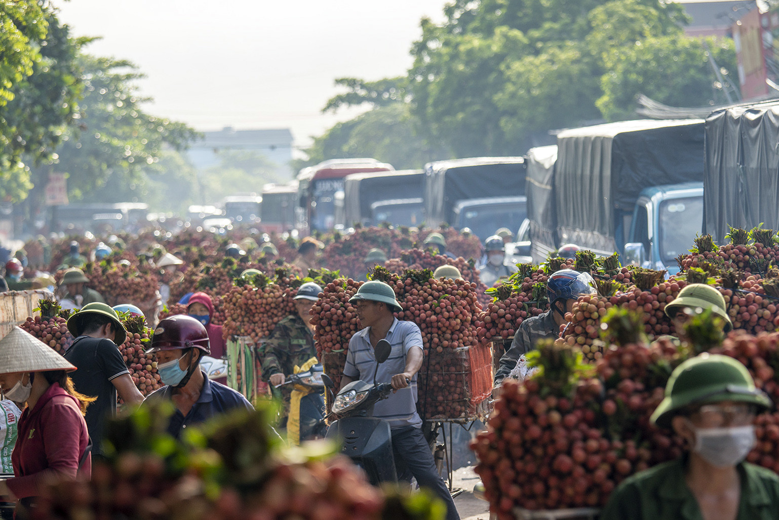 Cuối tháng 6, đầu tháng 7 là thời điểm mùa vải thiều Lục Ngạn (Bắc Giang) chín rộ. Người dân trồng vải thiều ở Lục Ngạn năm nay lại thu hoạch ước tính gần trăm nghìn tấn. Vụ mùa thường diễn ra trong một tháng. Anh Hoàng Văn Thanh phấn khởi khi vải năm nay được mùa. Vườn nhà anh với 5ha, trồng vải theo tiêu chuẩn xuất Nhật Bản. Những ngày qua, anh và mọi người trong gia đình phải dậy sớm đi hái, vận chuyển đến giữa trưa để kịp sơ chế và đóng gói. Vải sau khi thu hoạch từ vườn tập trung chủ yếu tại phố Kim và thị trấn Chũ, huyện Lục Ngạn. Đây được coi như một địa điểm trung chuyển giúp thương lái tới lấy hàng và chở đi mọi miền.Quốc lộ 31 những ngày này ngập tràn sắc vải. Một phần vải thiều sẽ được bán ở trong nước thông qua các thương lái nhỏ lẻ. Số còn lại được tuyển chọn kỹ càng đưa đi xuất khẩu.Riêng vải xuất khẩu được thu gom trong kho lớn. Trước đó, do ảnh hưởng của đại dịch Covid-19, các hoạt động giao thương, thu hoạch gặp không ít khó khăn, các chuyên gia của Việt Nam và Nhật Bản đã phải tìm cách tháo gỡ. Năm nay, phía Trung Quốc thực hiện kiểm dịch rất gắt gao, gồm cả kiểm dịch thực vật và kiểm dịch Covid-19 dẫn đến chậm tiến độ thông quan tại cửa khẩu. Nước này không khống chế lượng hàng Việt Nam đưa sang bao nhiêu xe mà phụ thuộc vào năng lực kiểm dịch của cả hai bên.Theo thông tin từ UBND huyện Lục Ngạn, vụ vải thiều năm nay dự kiến sản lượng quả tươi đạt khoảng 95.000 tấn, trong đó, vải chín sớm khoảng 21.000 tấn, vải chính vụ khoảng 74.000 tấn. Tính trên tổng toàn tỉnh này ước đạt 180.000 tấn, trong đó, vải sớm khoảng 60.000 tấn, vải chính vụ khoảng 120.000 tấn.Những ngày này, cây cầu phao Tòng Lệnh bắc qua sông Lục Nam (xã Trường Giang, huyện Lục Nam) gánh hàng nghìn chiếc xe máy chở vải đi qua. Không khí khá nhộn nhịp, khẩn trương.Toàn huyện có khoảng 16.000ha vải thiều, trong đó, hơn 12.000ha sản xuất theo tiêu chuẩn VietGAP (thực hành sản xuất nông nghiệp tốt theo tiêu chuẩn Việt Nam) và GlobalGAP (thực hành sản xuất nông nghiệp tốt theo tiêu chuẩn toàn cầu); gần 500ha xuất khẩu sang Nhật Bản, Mỹ, EU; 100% diện tích vải của huyện đạt tiêu chuẩn xuất khẩu chính ngạch sang Trung Quốc. Hiện giá bán vải ở Lục Ngạn khá cao và ổn định. Đến nay, huyện đã tiêu thụ hàng chục nghìn tấn, giá dao động từ 18.000 đến 35.000 đồng/kg, cao hơn so với năm 2021.