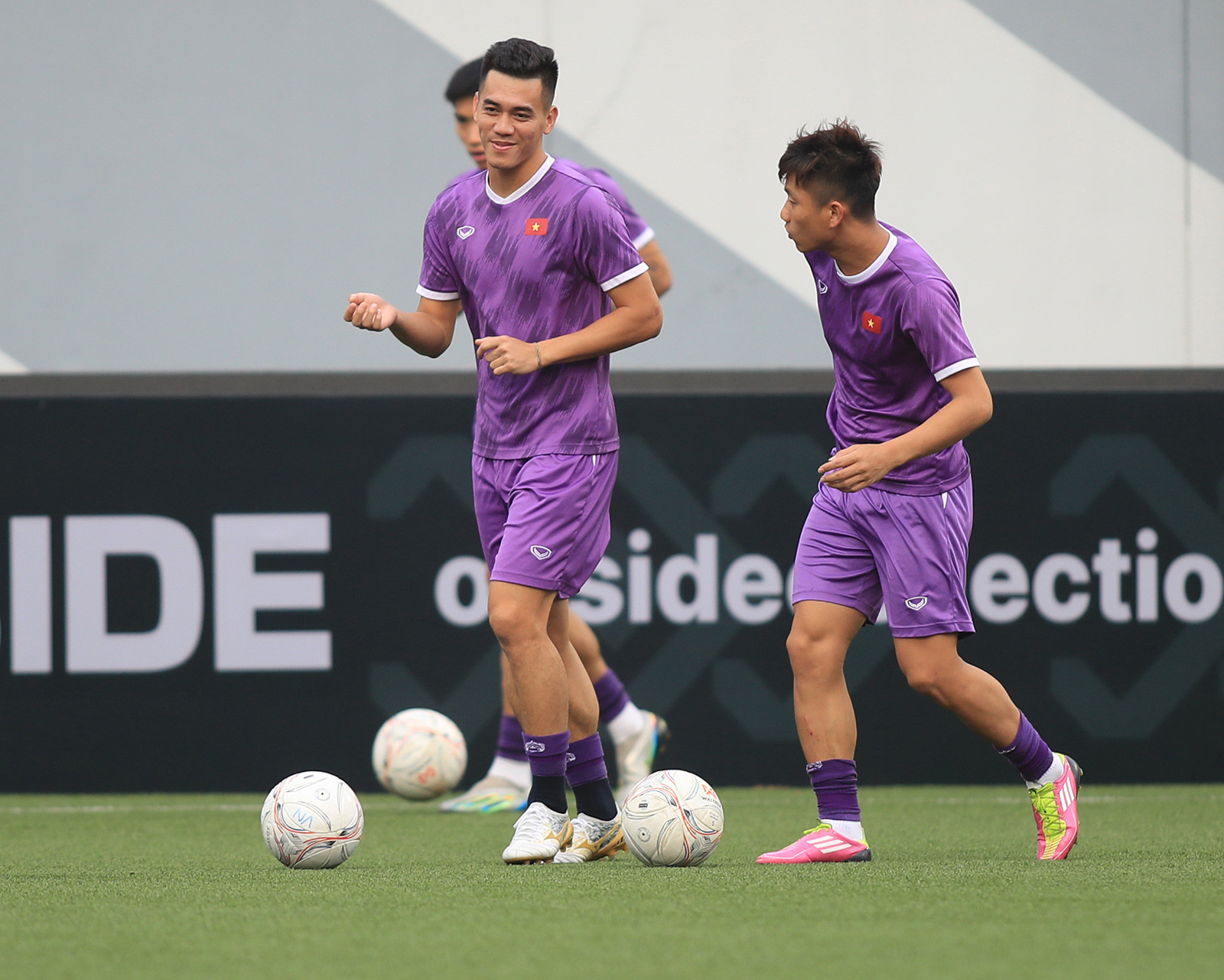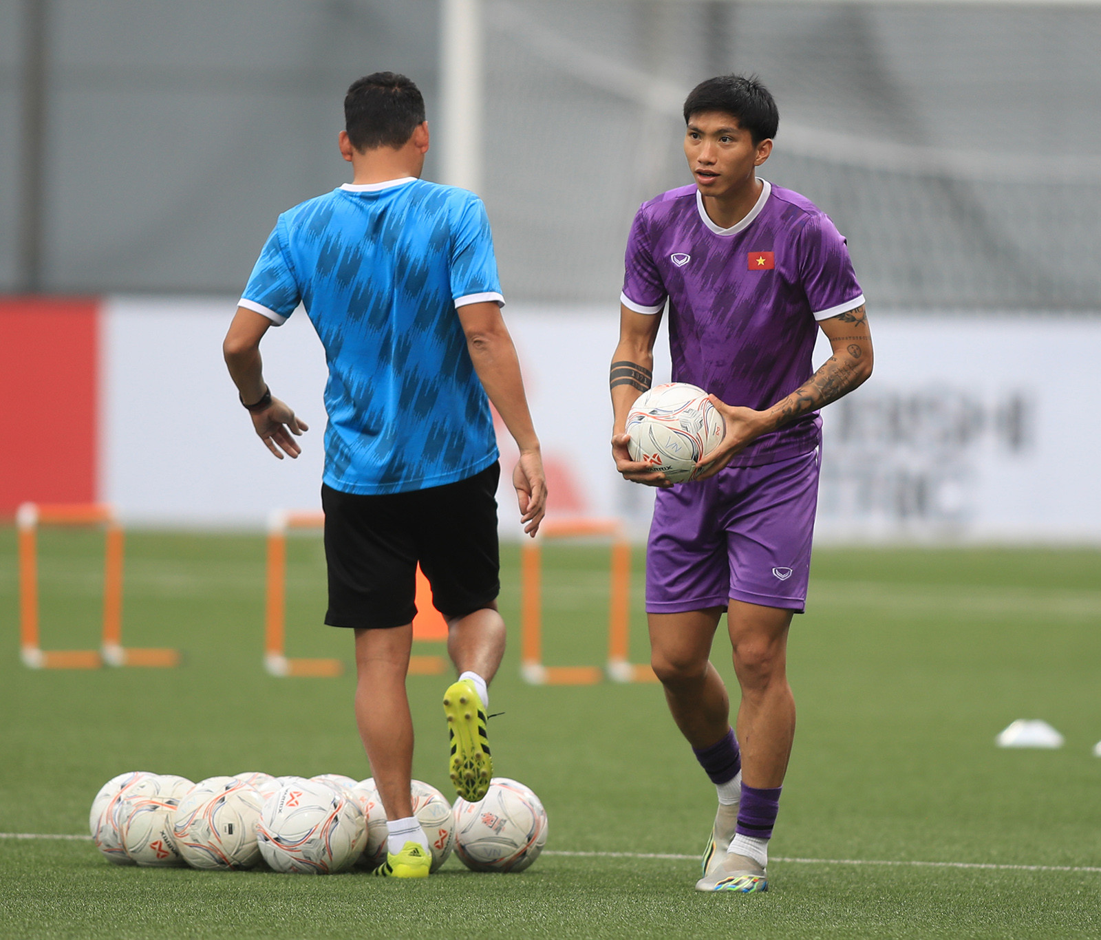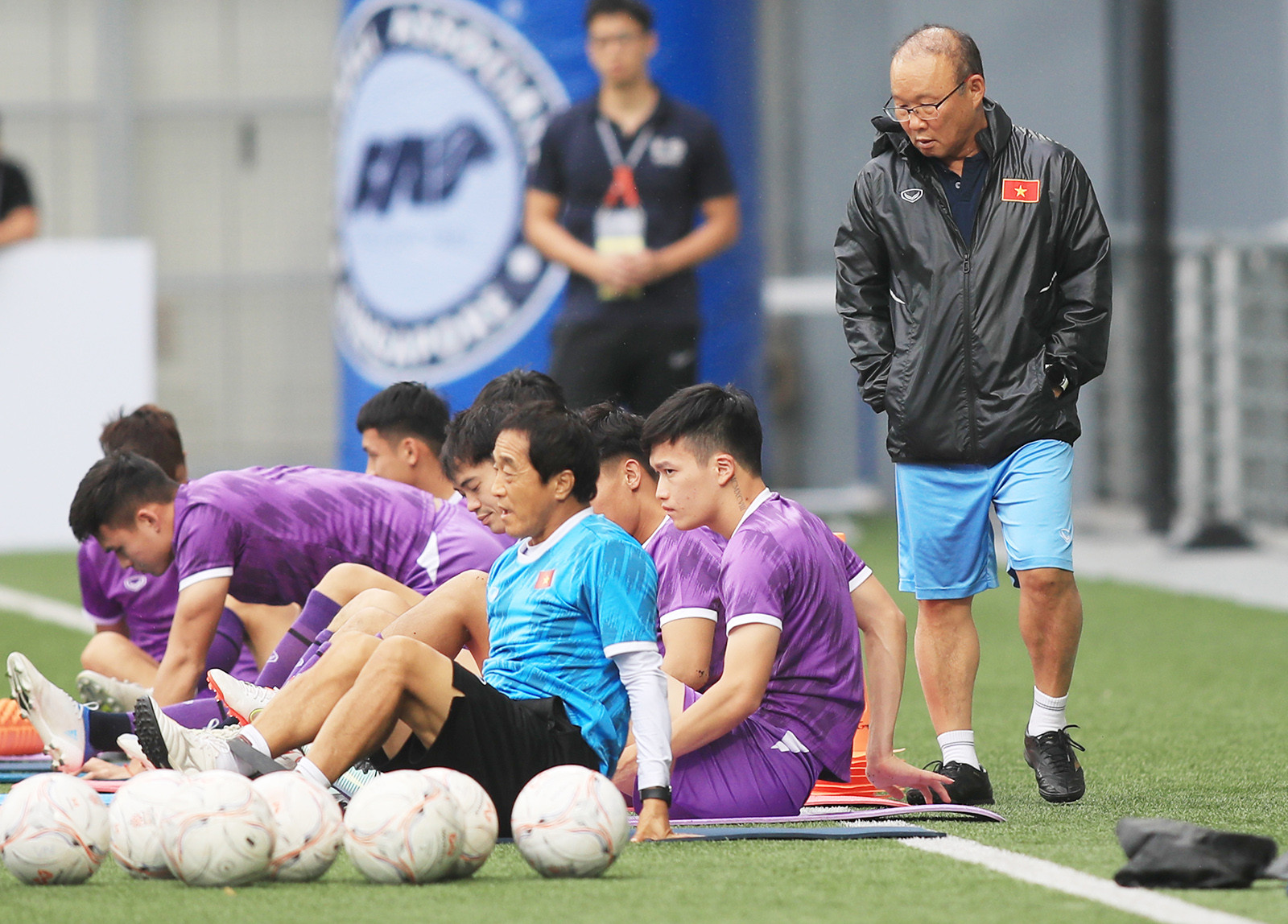 Sau khi đặt chân đến Singapore, tuyển Việt Nam lập tức bước vào buổi tập trên SVĐ Jalan Besar. Đây là sân cỏ nhân tạo, với sức chứa 6000 chỗ ngồi.HLV Park Hang Seo đích thân kiểm tra giày của các cầu thủ trong buổi tập này, bởi toàn đội phải đá trên mặt sân nhân tạo tại Singapore, với nguy cơ dính chấn thương cao hơnTuyển Việt Nam chỉ có 2 ngày tập làm quen với mặt sân cỏ nhân tạo nên HLV Park Hang Seo tỏ ra khá lo lắngThời tiết tại Singapore khá mát mẻ và thỉnh thoảng có mưa nên không ảnh hưởng tới chất lượng buổi tập của tuyển Việt Nam. Do vừa chạm trán Malaysia nên HLV Park Hang Seo chủ yếu cho học trò tập hồi phục thể lựcSau hai trận đấu, tuyển Việt Nam ghi được 9 bàn thắng và không để thủng lưới. Dù có hai chiến thắng để xếp ngôi đầu bảng B nhưng HLV Park Hang Seo vẫn tỏ ra khá thận trọng, chưa nghĩ tới tấm vé vào bán kết. Chiến lược gia người Hàn Quốc yêu cầu toàn đội có sự tập trung cao nhất cho trận đấu với SingapreQuế Ngọc Hải và Quang Hải khoác vai nhau trò chuyện trên sân Jalan Besar. Ở trận gặp Malaysia, Quế Ngọc Hải đóng góp 1 bàn thắng trên chấm 11m, trong khi Quang Hải vào sân ở phút 80 và có một pha kiến tạo cho Hoàng Đức ấn định chiến thắng 3-0Tinh thần của tuyển Việt Nam rất thoải máiTiến Linh và Phan Văn Đức quyết "nổ súng" trong trận gặp SingaporeHậu vệ Đoàn Văn Hậu nhận nhiều ý kiến khen chê bởi lối chơi quyết liệt quá mức cần thiết ở trận thắng MalaysiaDù vậy, cầu thủ sinh năm 1999 không quan tâm, bởi điều quan trọng nhất là cùng tuyển Việt Nam giành chiến thắng để chinh phục ngôi vô địch AFF Cup 2022. Trận đấu giữa tuyển Việt Nam vs Singapore sẽ diễn ra vào lúc 19h30 ngày 30/12 (20h30 giờ địa phương).