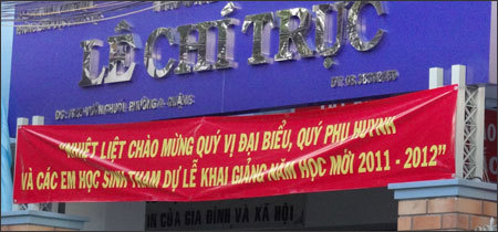 Nhưng không hiểu sao ngành GD-ĐT lại cẩn thận đến mức hướng dẫn luôn cả cách treo băng-rôn và cách viết khẩu hiệu trong ngày lễ của thầy và trò này. “Văn mẫu” mà ngành GD-ĐT TP yêu cầu đó là thủ trưởng các đơn vị phải nghiêm túc thực hiện gồm: băng-rôn ở cổng trường có dòng chữ “Nhiệt liệt chào mừng quý vị đại biểu, quý vị phụ huynh và các em học sinh tham dự lễ khai giảng năm học mới 2011 - 2012” (ảnh); từ phông sân khấu cho đến bên trái sân khấu là: “Đổi mới căn bản, toàn diện nền giáo dục theo hướng chuẩn hóa, hiện đại hóa, xã hội hóa, dân chủ hóa và hội nhập quốc tế”, bên phải sân khấu: “Năm học tiếp tục đổi mới toàn diện nhà trường, hoàn thành phổ cập mầm non cho trẻ năm tuổi”. Cuối cùng, ở vị trí đối diện sân khấu phải là: “Tất cả vì một nền giáo dục tiên tiến mang đậm bản sắc dân tộc”.