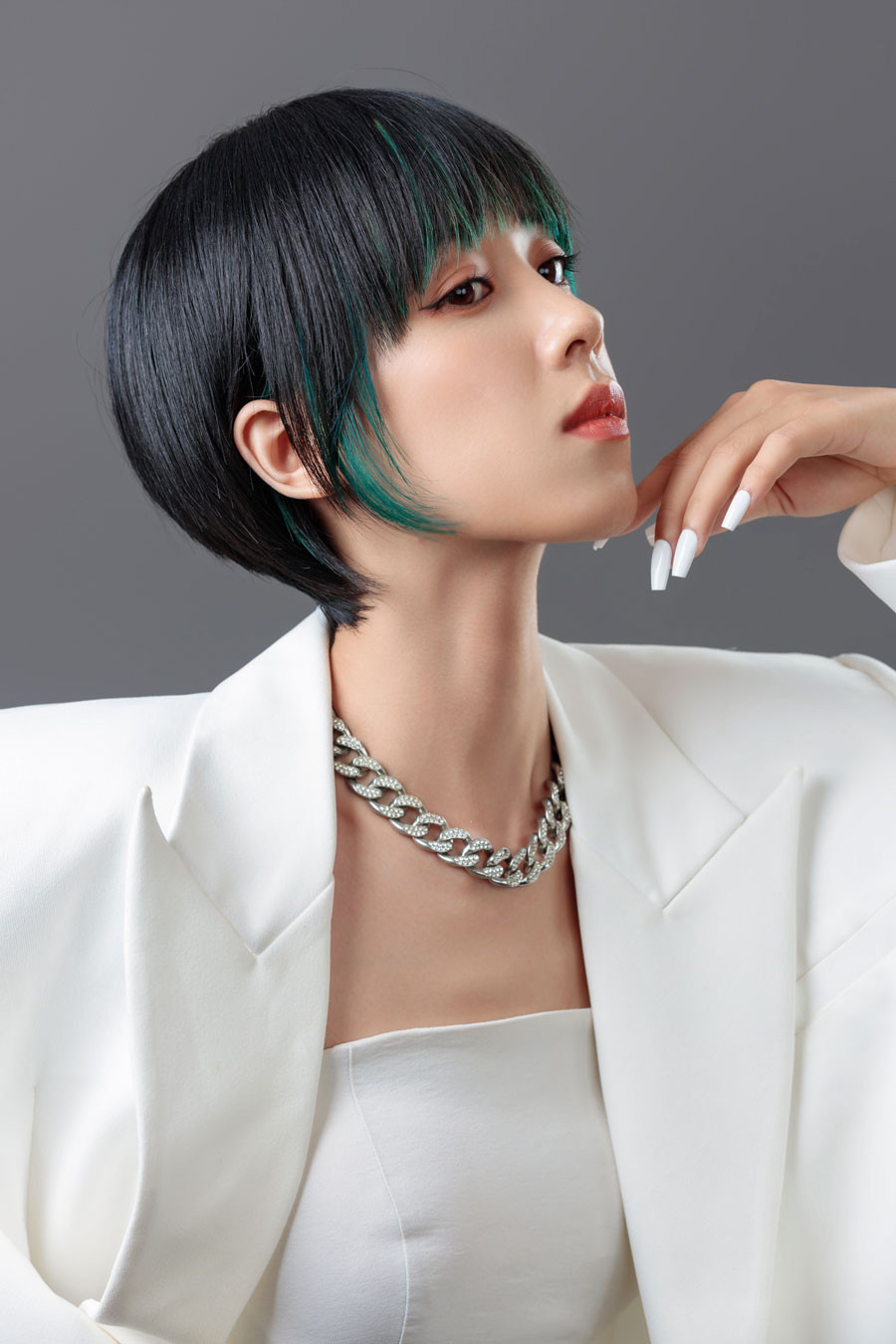 Mẫu Bixie Gem sử dụng kĩ thuật cắt Bixie mang đến một mái tóc ngắn đầy cá tính kết hợp với kỹ thuật nhuộm Hidden Light trên mái và mai đầy sáng tạo, tinh tế. Một kiểu tóc trung hoà được sự an toàn mà không kém phần cá tính.